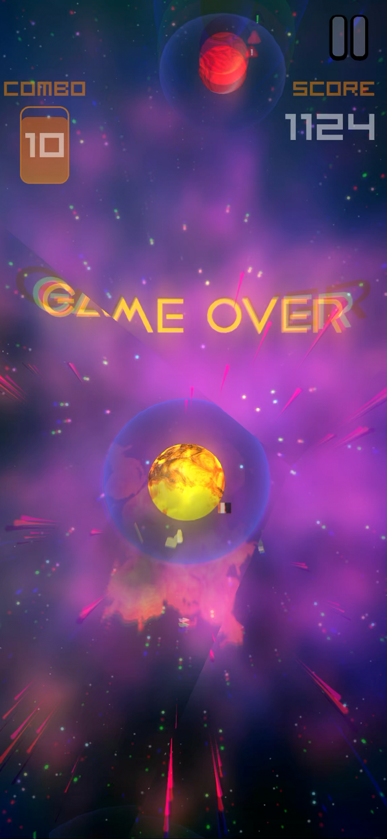 Score points by threading your ship through the chaos of deep space, and build your combo by flying dangerously close to planets. But don’t get too close… one slip and your ship takes damage, your display cracks, and your view of the galaxy begins to glitch!